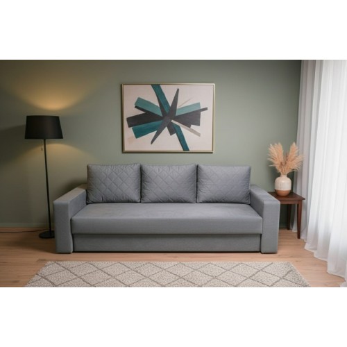 Visas dīvāna daļas uz atsperu blokiem. Dīvāna aprīkojumā ir veļas kaste.